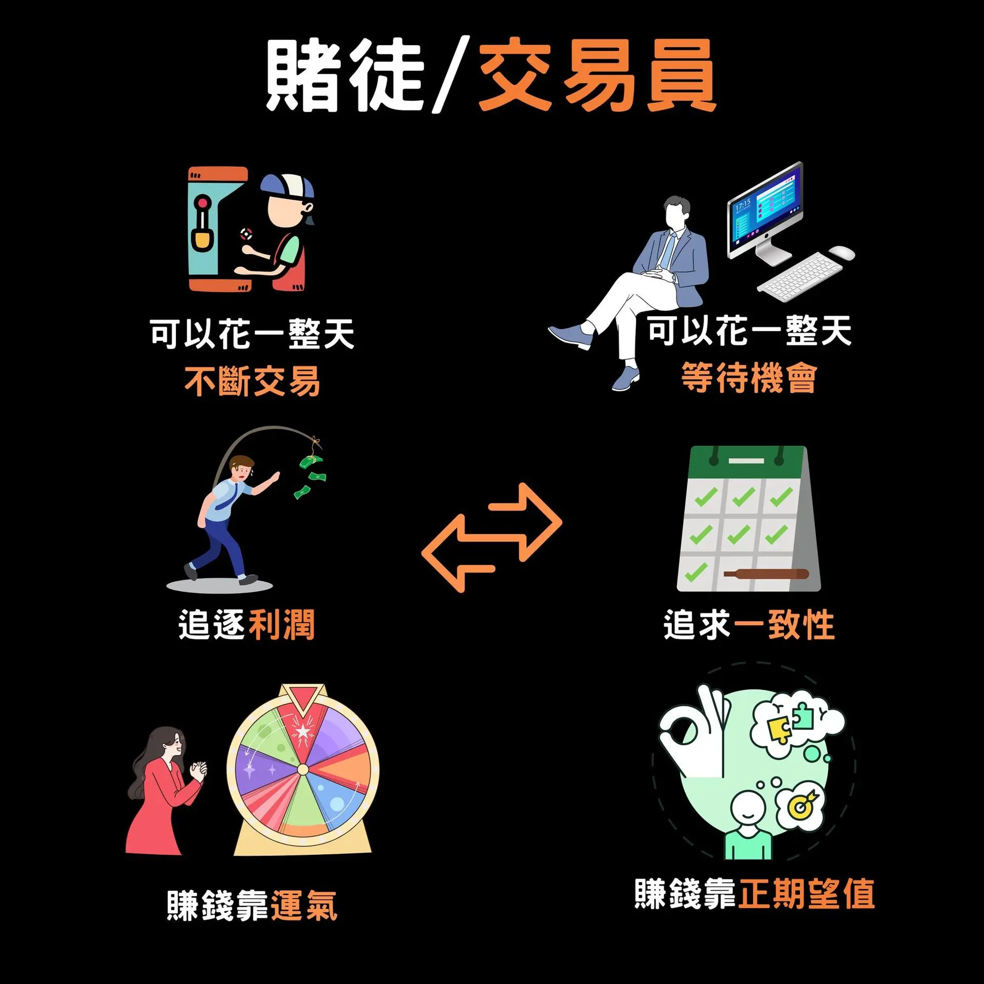 1. 賭徒認為賺錢是靠不斷交易;交易員認為賺錢是要等待好機會才出手
